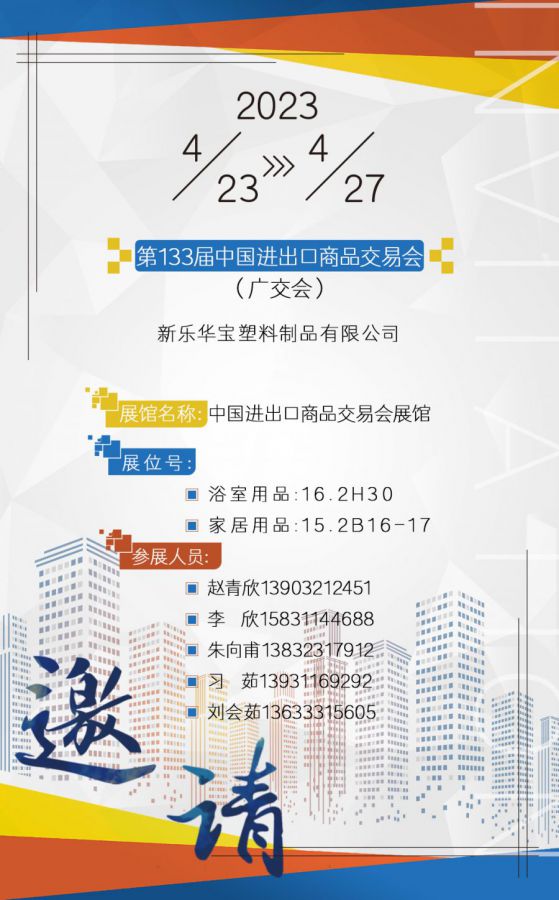 當(dāng)前位置:網(wǎng)站首頁(yè) 新聞動(dòng)態(tài) 展會(huì)信息 廣交世界,互利天下,新樂華寶塑料制品二期展位號(hào):浴室用品16.2H30 /家居用品15.2B16-17